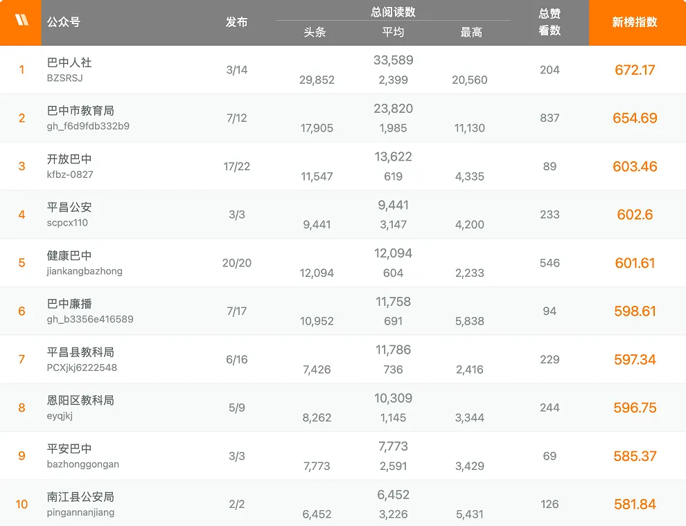 在本周政务类榜单中,“巴中人社”以33589次阅读量总数,672.17新榜指数领跑政务类榜单;“巴中市教育局”以23820次阅读量总数,654.69新榜指数获得政务类榜单第二名。