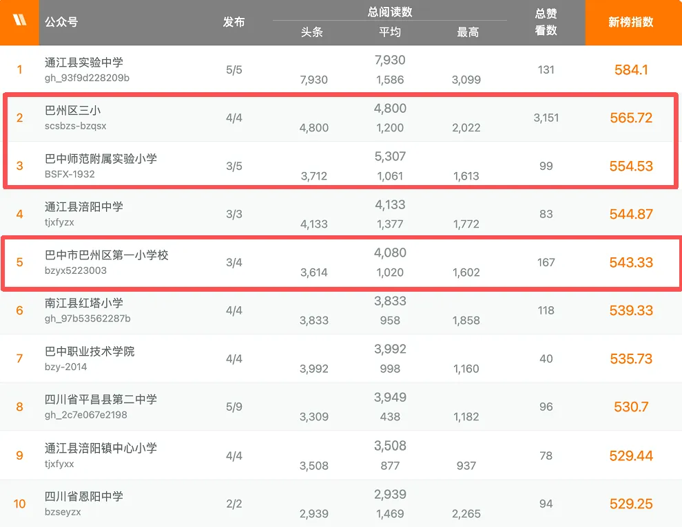在本周教育类榜单中,“通江县实验中学”以7930次阅读量总数,584.1新榜指数领跑教育类榜单;“巴州区三小”以4800次阅读量总数,565.72新榜指数获得教育类榜单第二名。