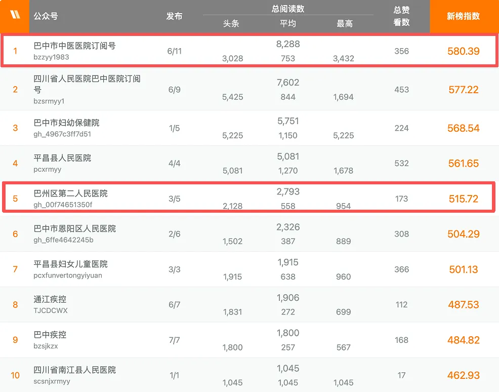 在本周卫生类榜单中,“巴中市中医医院订阅号”以8288次阅读量总数,580.39新榜指数领跑卫生类榜单;“四川省人民医院巴中医院订阅号”以7602阅读量总数,577.22新榜指数获得卫生类榜单第二名。