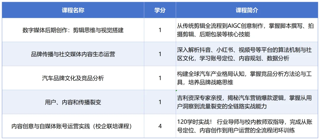 别看它只有5门课,但却是打通理论和实践,与行业一线同步的实战训练。你将在短短一学期内,接受校内导师和吉利汽车集团企业导师的手把手陪跑,用真实的账号、真实的选题、真实的流量数据,检验你的内容创作能力。
