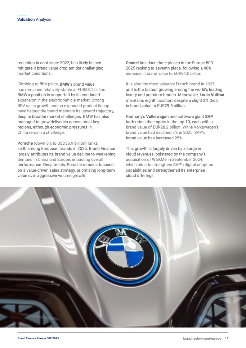6. 保时捷:品牌价值369亿欧元(同比下降8%),受中欧市场需求减弱影响。