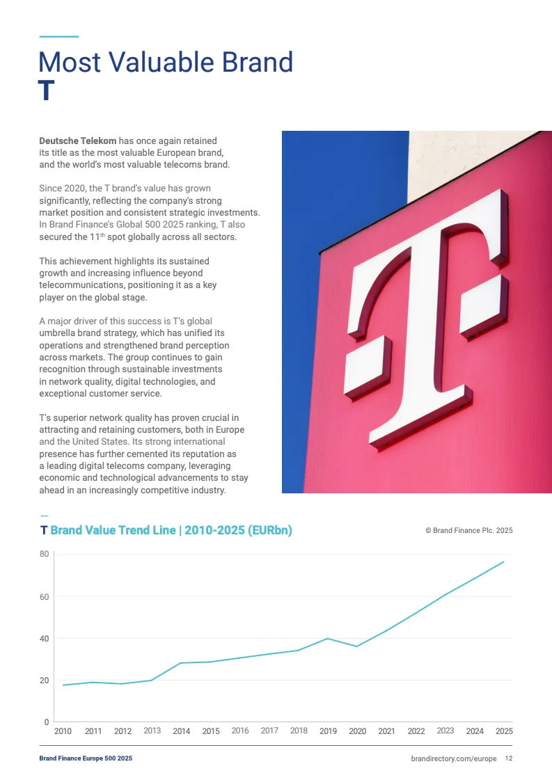1. T(德国电信):蝉联榜首,品牌价值765亿欧元(同比增长12%),连续三年居欧洲第一、连续两年为全球最具价值电信品牌,作为欧洲最大的电信运营商,其业务覆盖全球多个国家和地区。。