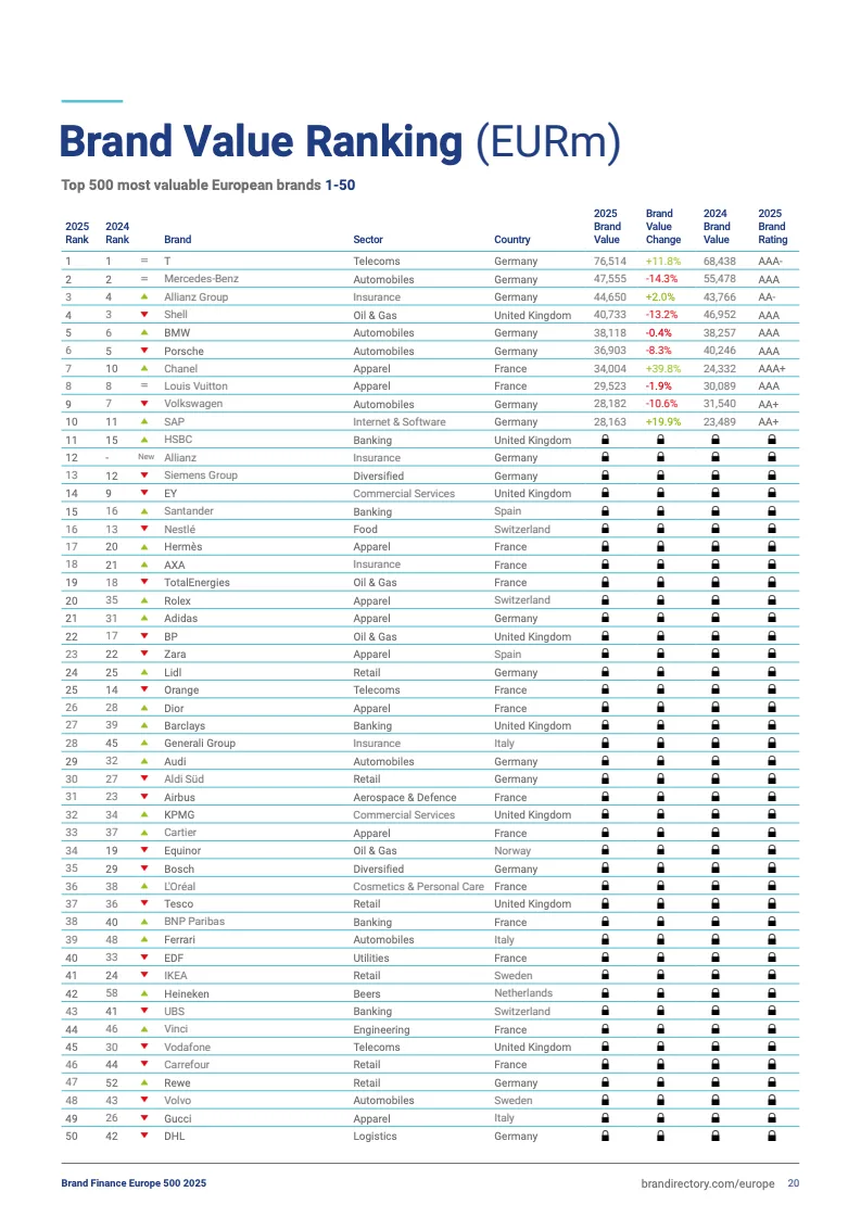 注:前十中,德国品牌7席、法国2席、英国1席,核心集中在电信、汽车、奢侈、科技等领域。