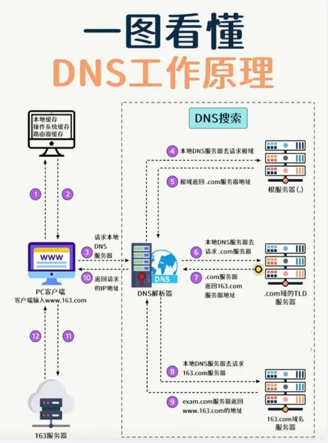 简单说,DNS就是互联网的“114查号台”和“电话号码本”,负责把人类能看懂的名字,翻译成电脑能懂的数字地址\——本质上就是一个分布式的巨型电话号码簿。