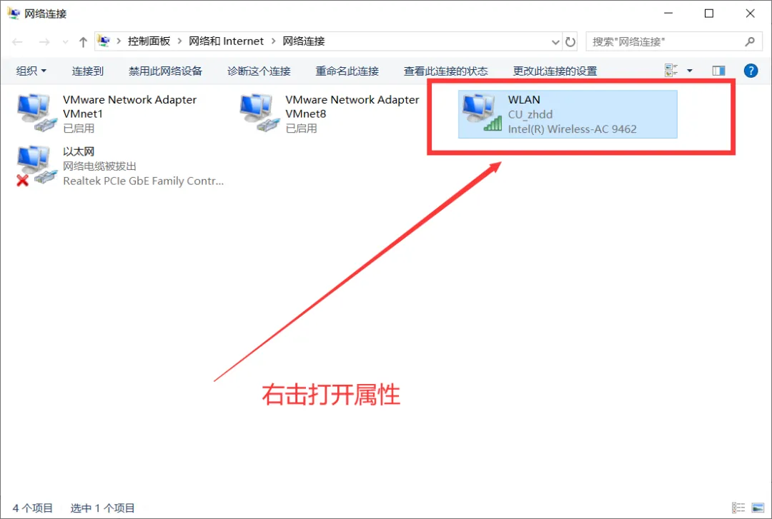 右键你正在连的WiFi图标,选“属性”。