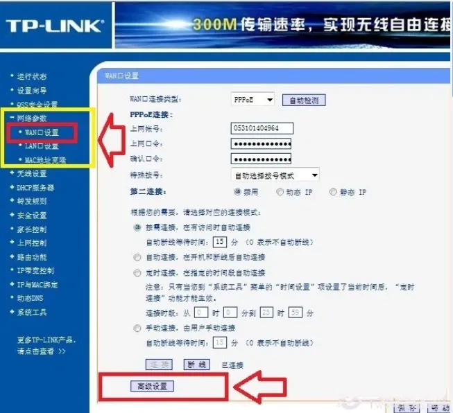 在WAN口设置页面底部,有个"高级设置"入口,点进去。