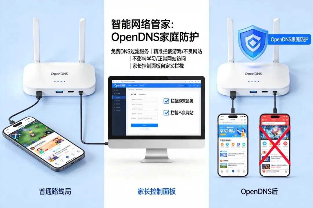 它本质是一个免费的DNS过滤服务。你把它设成你家的“电话本”之后,它会自动替你拦截游戏、不良网站,但正常的百度、学习平台、微信照样能打开。