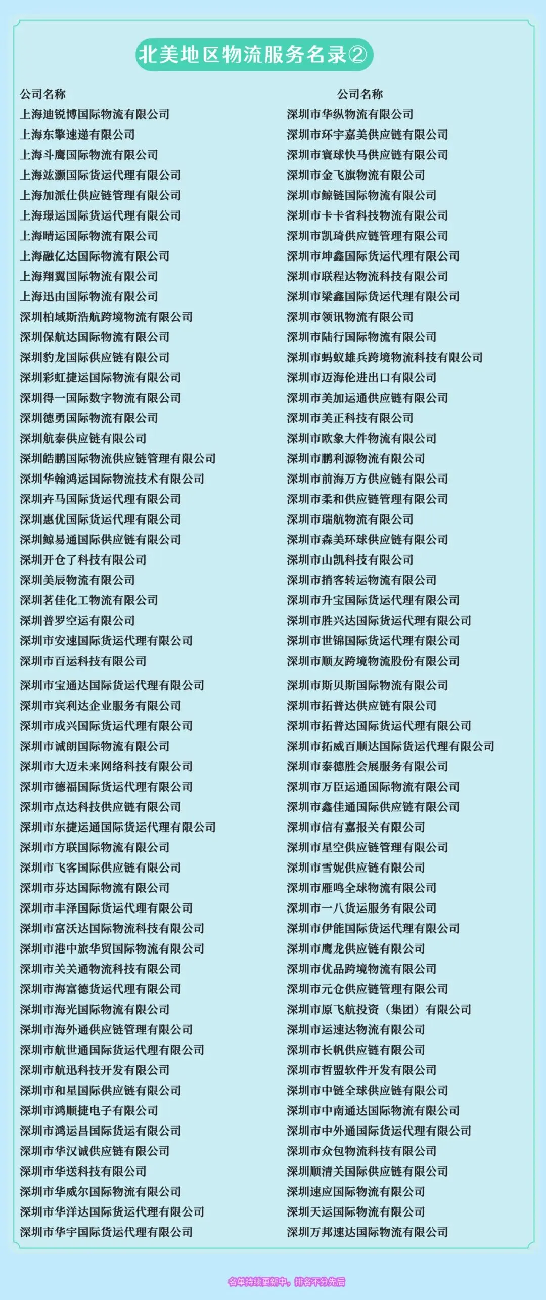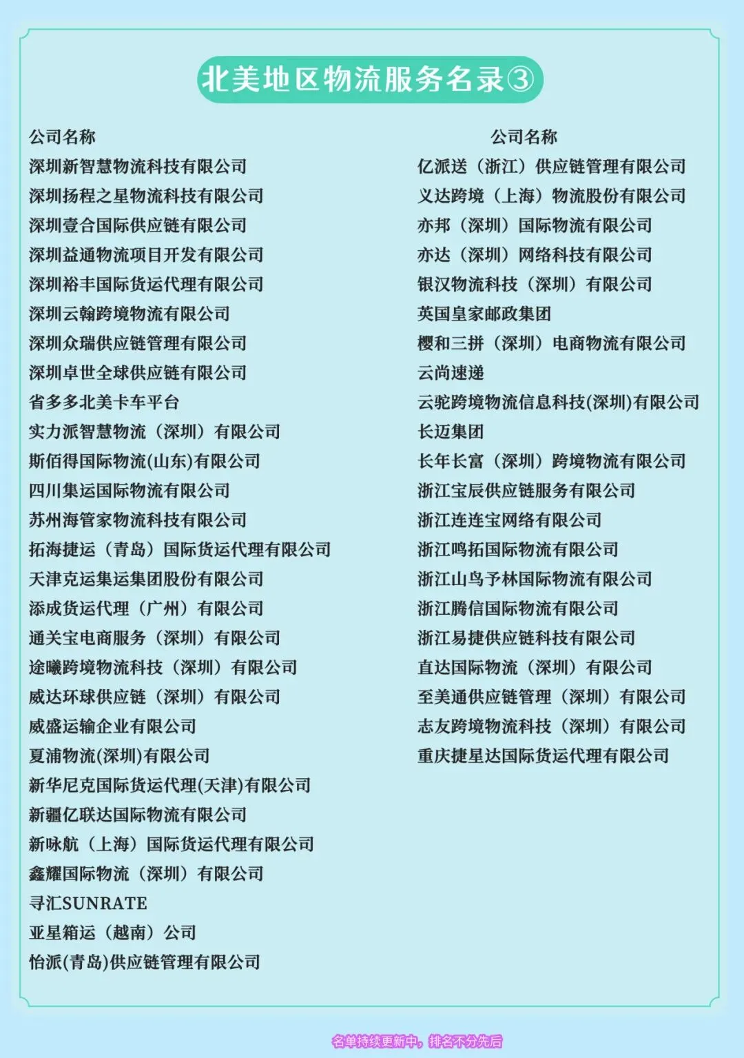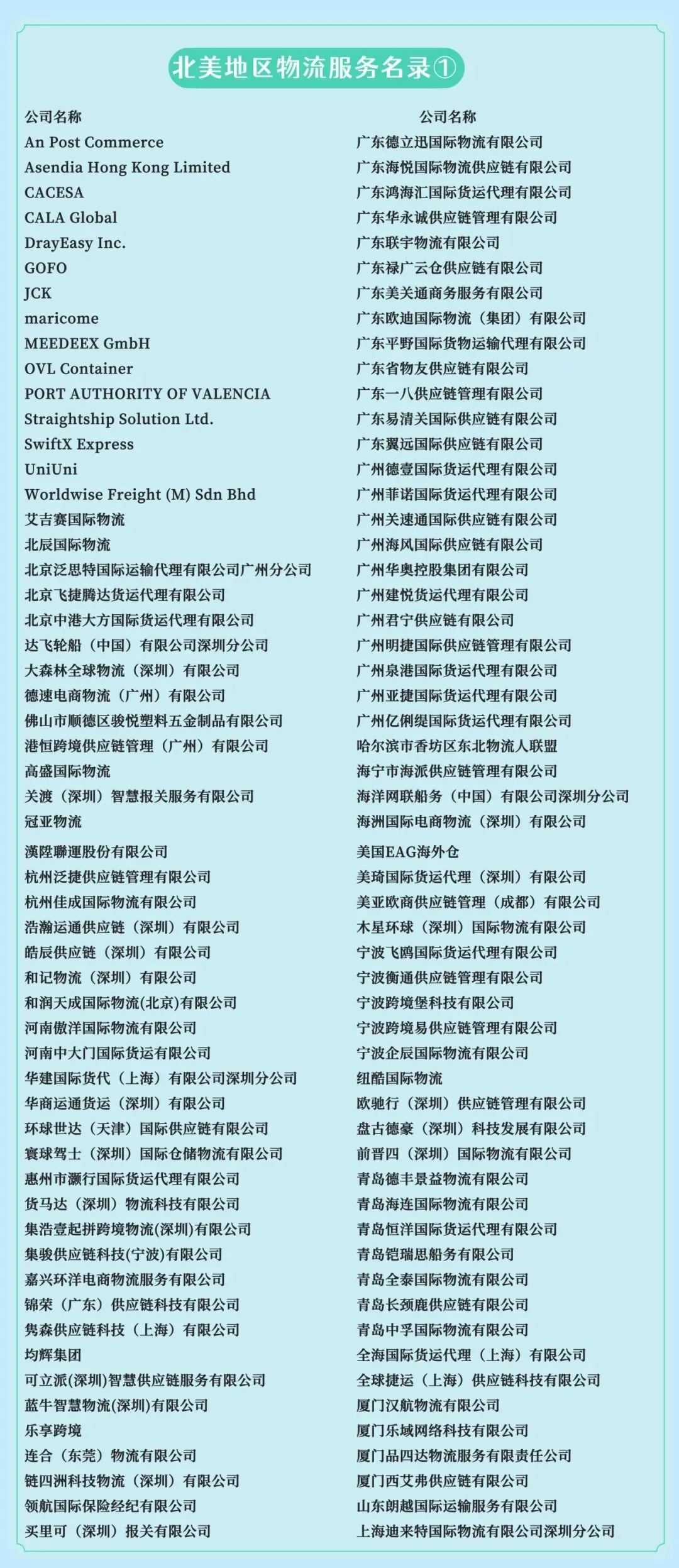 以下为近300家在北美市场已开展海外仓、清关、尾程派送、头程或综合供应链服务的展商名单。这批企业构成了连接全球供应链与北美市场的一支重要力量,也与《2026北美3PL百强》所代表的专业化、区域化趋势形成共鸣。