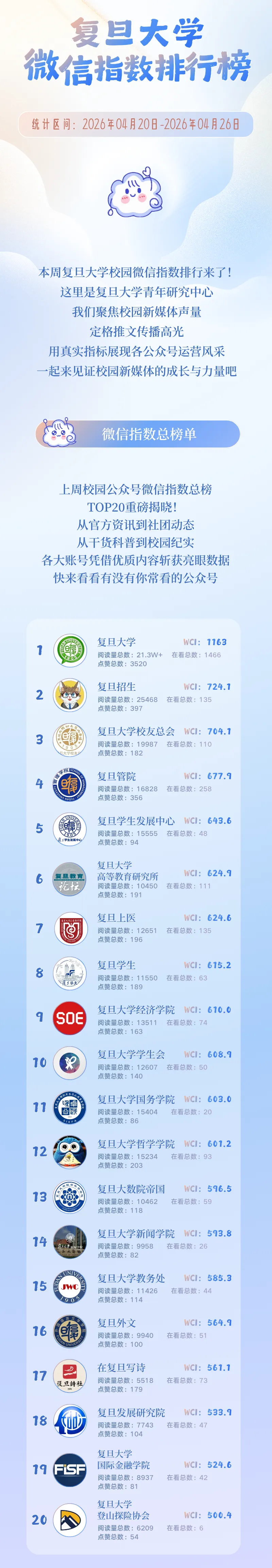青年数据丨复旦大学校园微信指数排行榜(2026年04月20日—2026年04月26日)