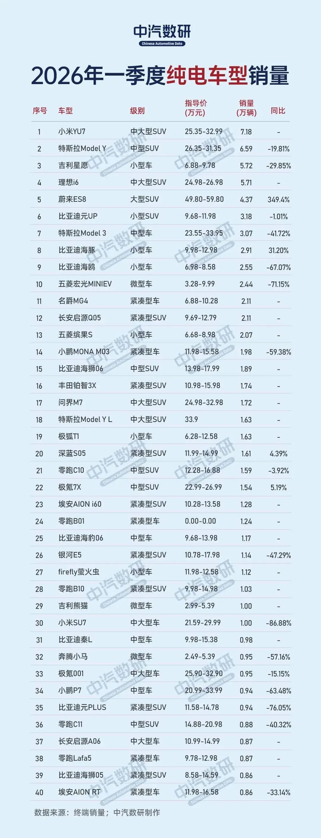 2026年一季度纯电车型终端上险量数据出炉,第一梯队依旧特斯拉、比亚迪两大品牌领先。
