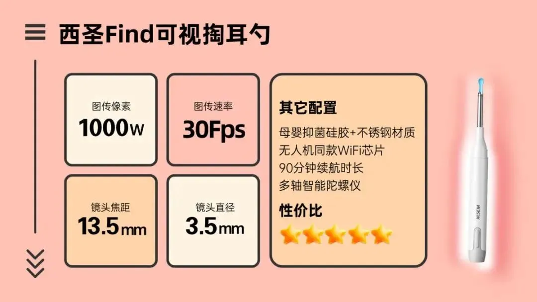 >>西圣Find:这款产品像素表现稳定,采用1000万像素纳米级高清镜头,成像清晰通透,对焦响应及时,日常掏耳能清晰识别各类耳垢,画面传输流畅,小幅移动探头也不会出现模糊,家用完全够用。