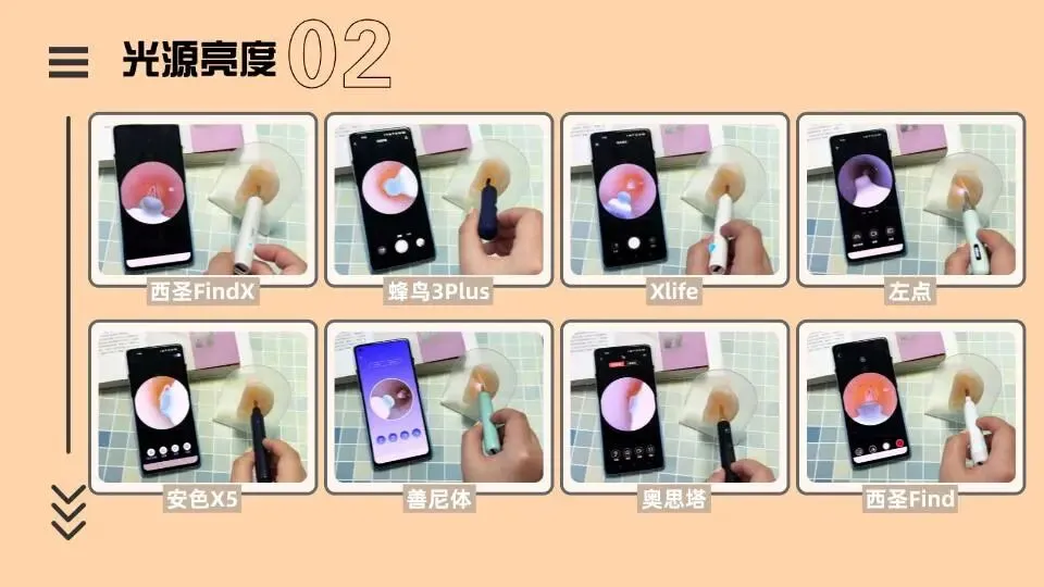 >>奥思塔、左点、安色X5:灯珠数量少,亮度不足,照明范围狭窄,仅能照亮耳道入口位置,深处几乎无法看清,光线均匀度差。品牌方可优化光源数量与光学布局,提升照明效果。