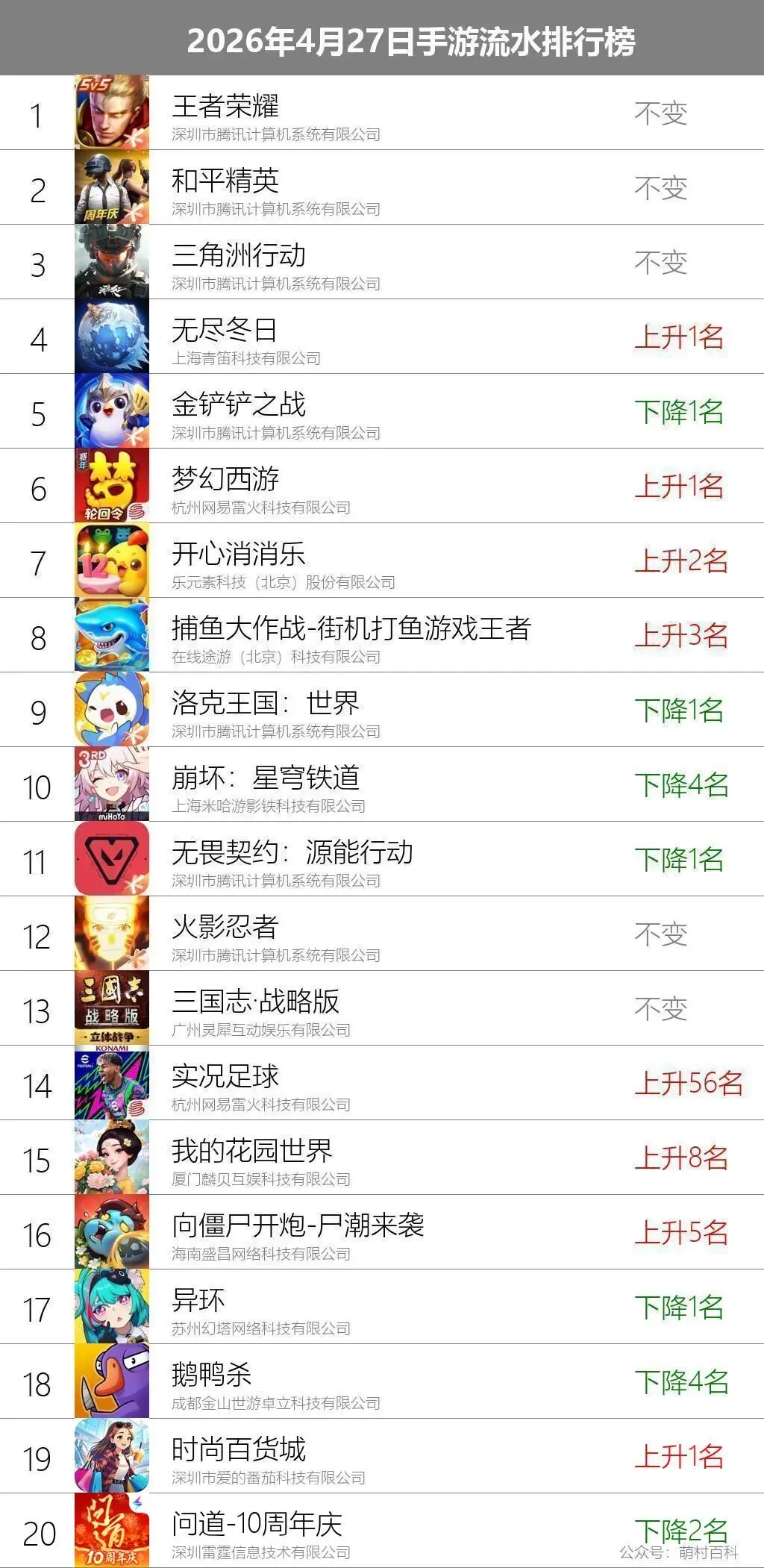 4月27日手游流水排行榜。数据来源于iOS中国区畅销榜数据,数据节点为2026年4月27日22:00。