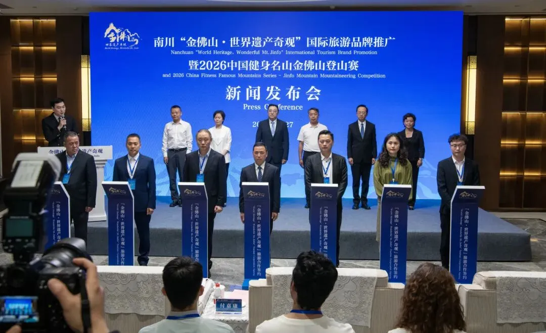 4月27日,“金佛山·世界遗产奇观”国际旅游品牌推广暨2026中国健身名山金佛山登山赛新闻发布会,在重庆国际会客厅圆满落幕。重庆市文旅委、重庆文旅集团、市对外文化交流协会、南川区相关领导出席,人民日报、新华社、总台及多家海外主流媒体共25家平台现场报道。
