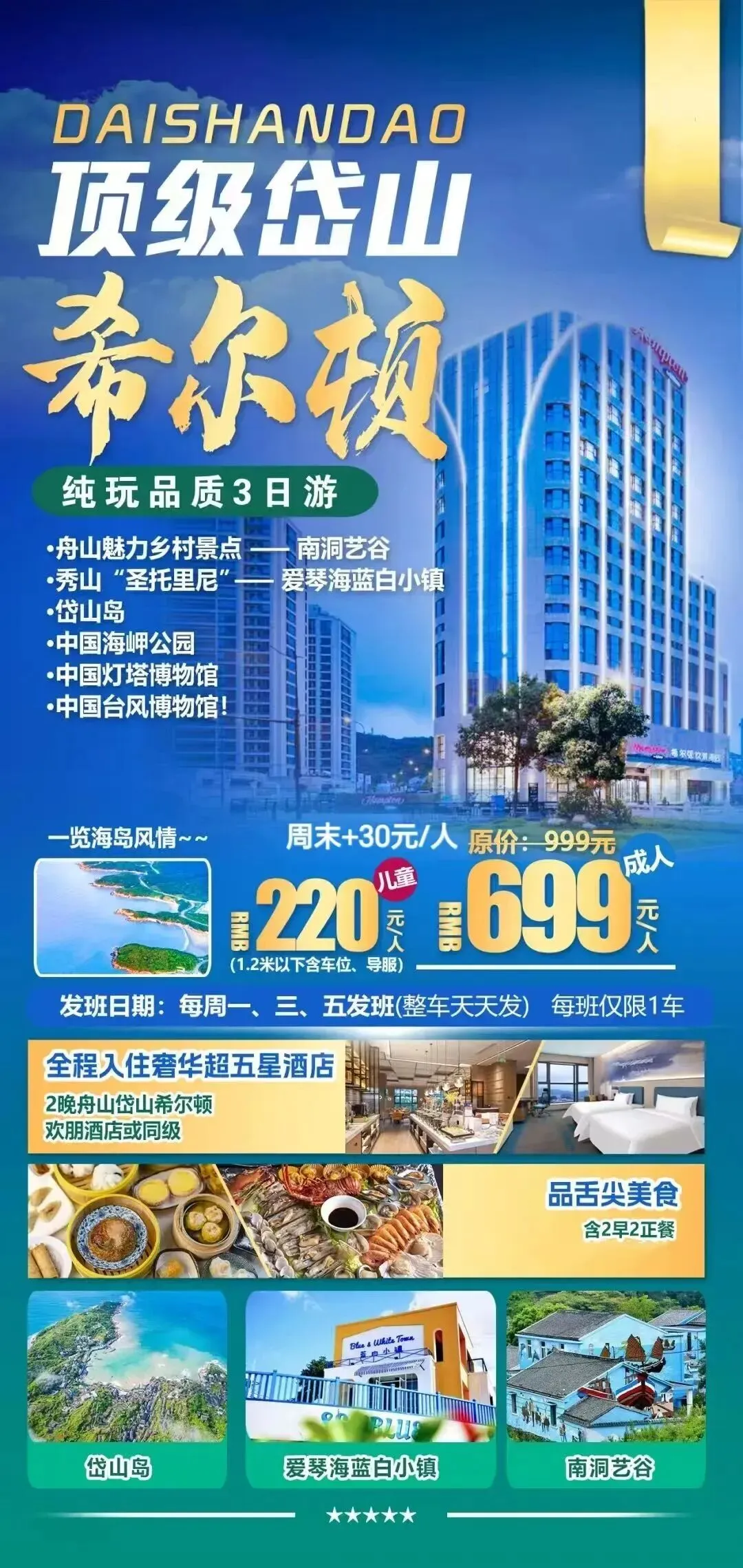 ★住宿:2晚舟山岱山希尔顿欢朋酒店或同级(单房差500元/人,务必带好身份证)
