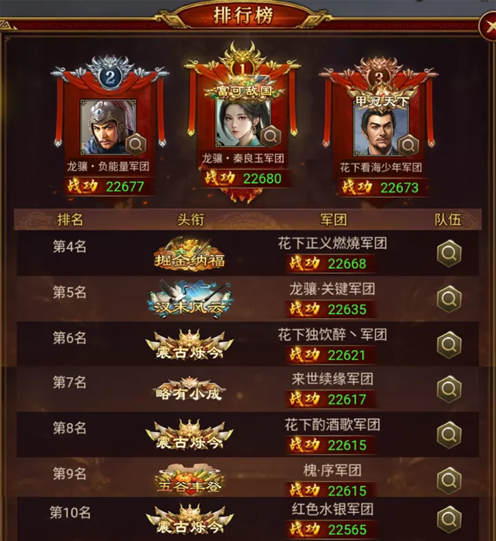 大大们也可以点击排行榜中 “队伍”查看 - 武将头像 来查看Top10大大们所配备的武将信息及对应的技能搭配噢~