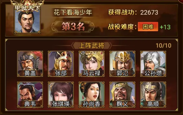 以 22673 的优秀战功赢得第三位的是 花下看海少年 军团!成功攻克战役困难13,恭喜!
