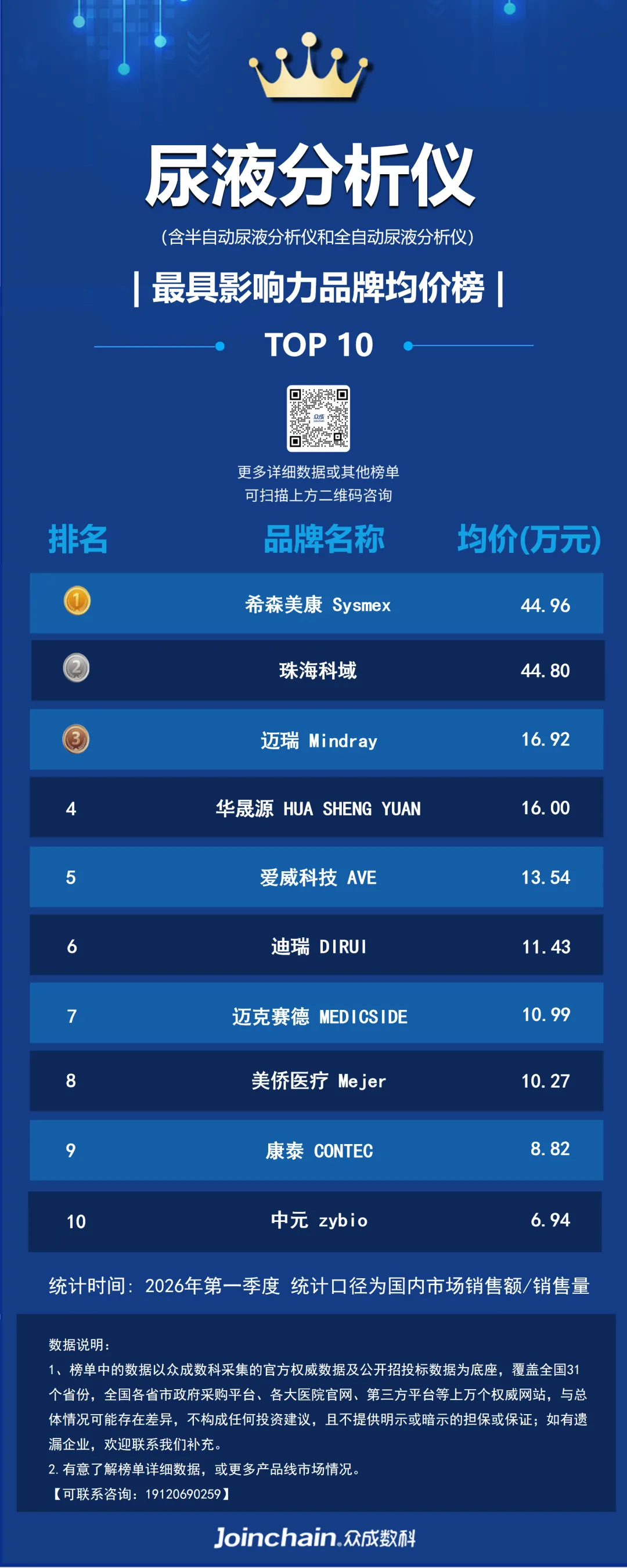 2026年第一季度尿液分析仪最具影响力品牌均价榜(按总销售金额/总销售量)