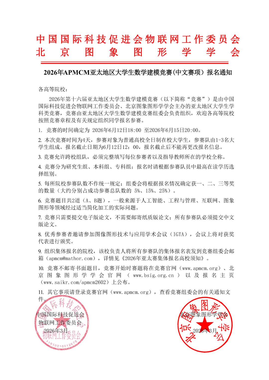 2026年第十六届亚太地区大学生数学建模竞赛(中文赛项)(以下简称“竞赛”)是中国国际科技促进会物联网工作委员会和北京图象图形学学会联合主办的亚太地区大学生学科类竞赛,竞赛由亚太地区大学生数学建模竞赛组委会负责组织,欢迎各高等院校按照竞赛章程及有关规定组织同学报名参赛。