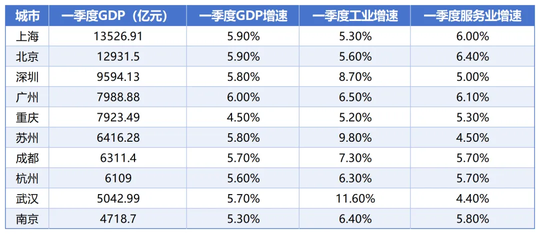 从今年一季报看,十强城市依次是上海、北京、深圳、广州、重庆、苏州、成都、杭州、武汉和南京。十强城市GDP增速分别为5.9%、5.9%、5.8%、6.0%、4.5%、5.8%、5.7%、5.6%、5.7%和5.3%。