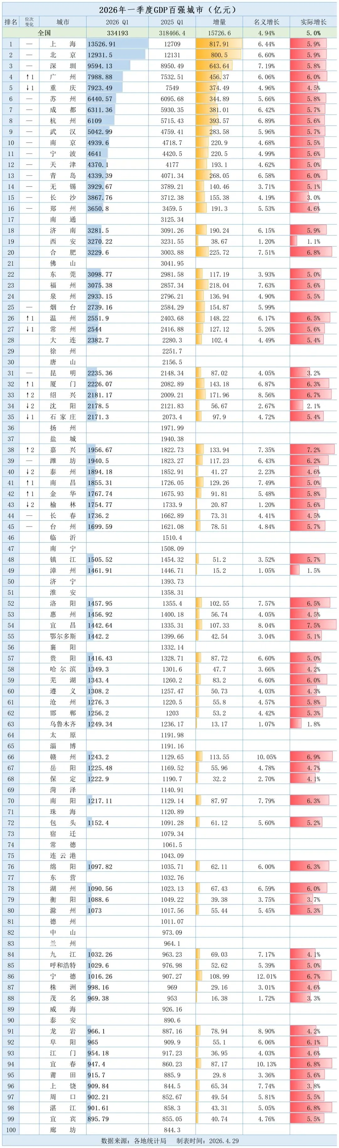 2026年一季度GDP百强城市更新中:南京、无锡、西安、福州、烟台等出炉