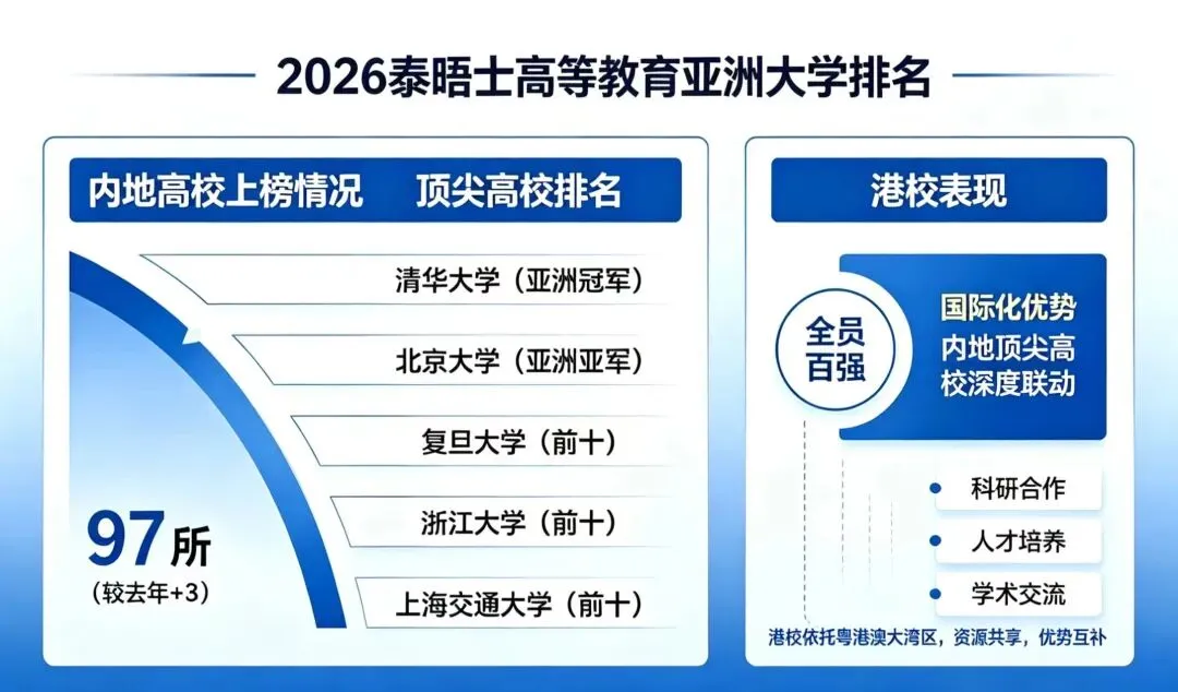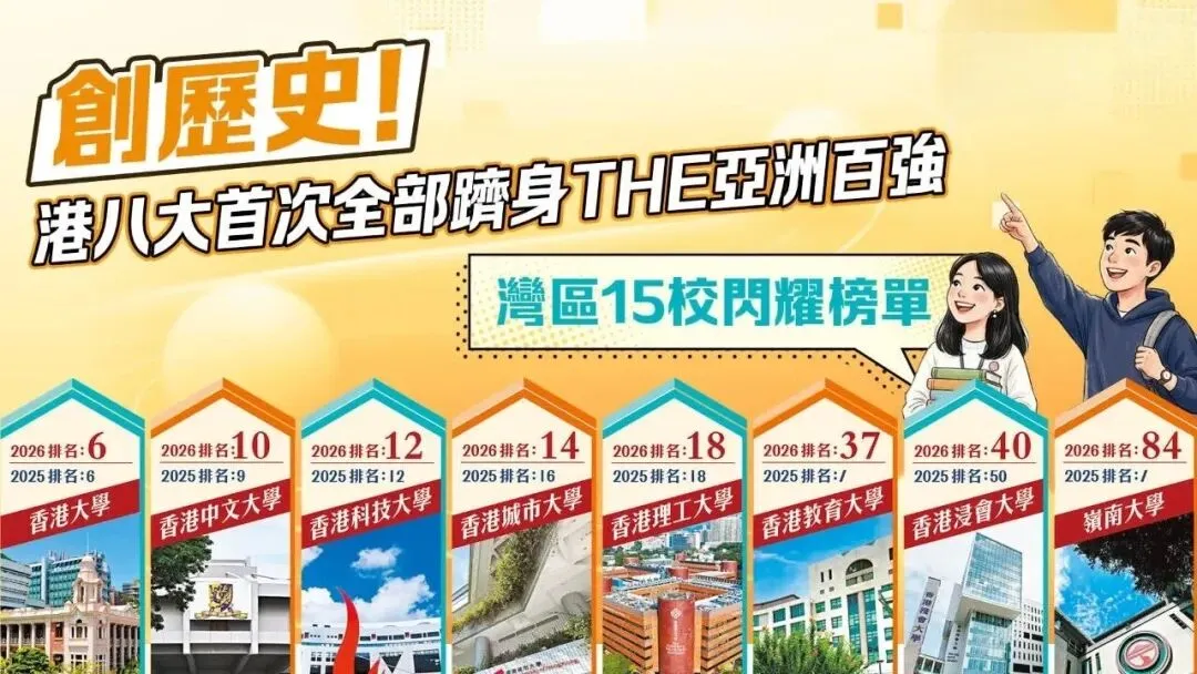 2026年泰晤士高等教育(THE)亚洲大学排名正式发布。香港八所资助大学,首次全员跻身亚洲百强;这是亚洲高教格局的一张新地图,也是香港作为国际教育枢纽的强力注脚。