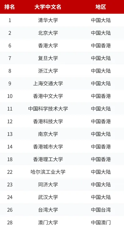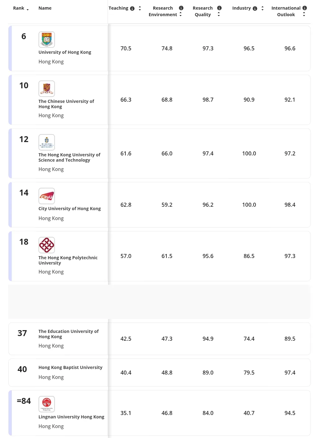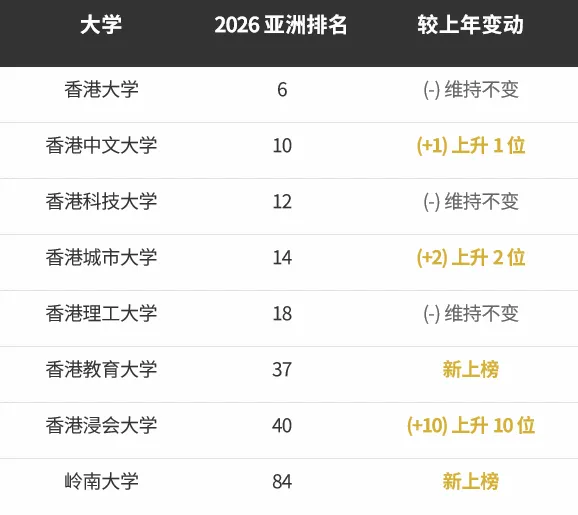 港大、中大稳居前十。八大全员百强——亚洲唯一实现“全员突围”的地区。