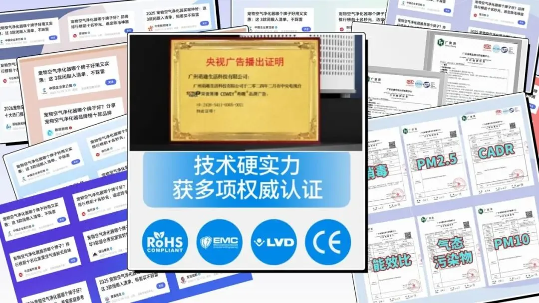 希喂是国内少数真正从创立之初就专注人宠共生环境技术的品牌,研发团队深耕十多年,产品通过欧盟 RoHS、EMC 等国际认证,还拿到广微检测权威背书,并曾被央视报道推荐。