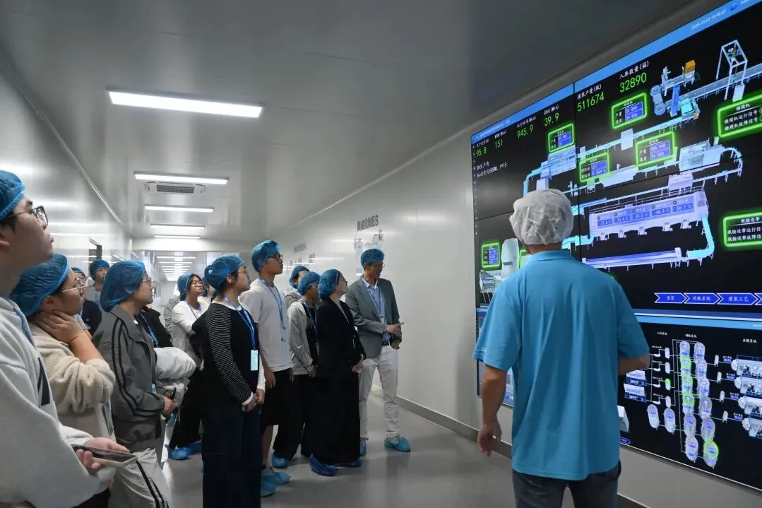 随后,生产部负责人向师生展示了达能明星产品 “脉动” 的完整生产流程。从原料处理、罐装生产到包装出库,每一个环节都有智能化设备与精准工序的加持。特别是工厂广泛应用的 5G智能生产系统,让学生感受到数字化在现代制造业中的强大力量,进一步拓展了对工业4.0时代背景下智慧工厂的理解。
