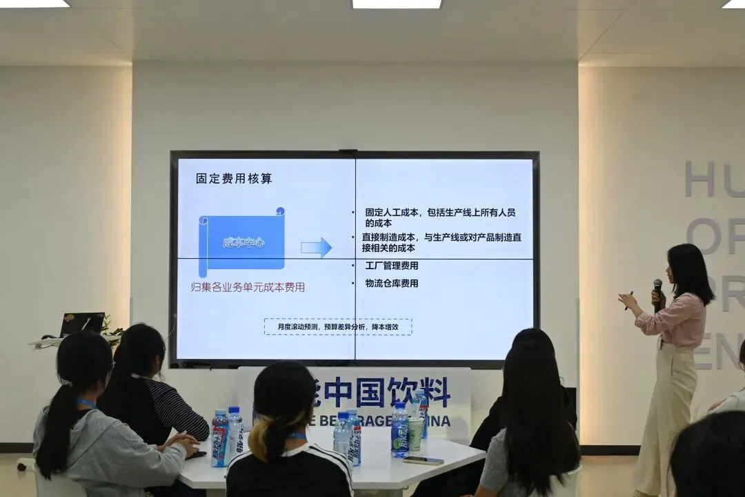 接着,在财务主题分享环节,达能中山工厂财务经理从管理会计视角出发,为师生讲解了企业在运营中使用的智能会计系统以及 CBU专业财务团队的运作机制。同时还重点介绍了工厂在脉动生产过程中如何运用标准成本法(Standard Costing) 对生产成本进行归集与分析,从而提升运营效率与管理水平。她指出,营运财务(Operational Finance)不仅是财务部门,更是业务伙伴,其价值在于帮助企业实现科学决策、优化资源配置、驱动业务增长。
