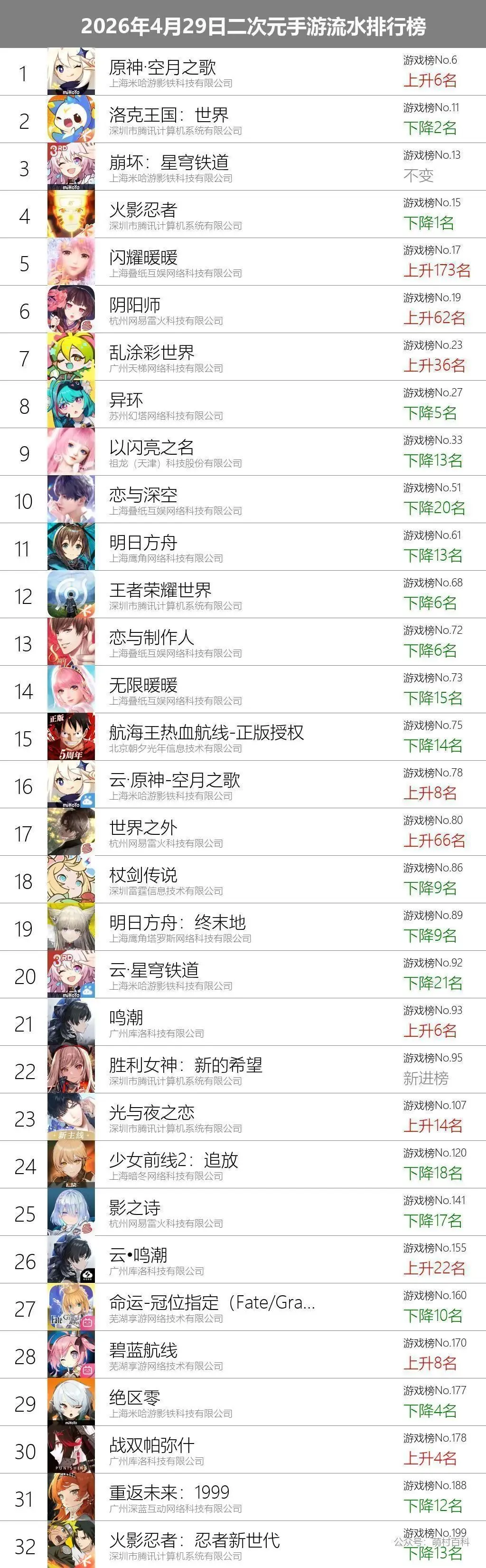 4月29日二次元手游流水排行榜。数据来源于iOS中国区畅销榜数据,数据节点为2026年4月29日22:00。