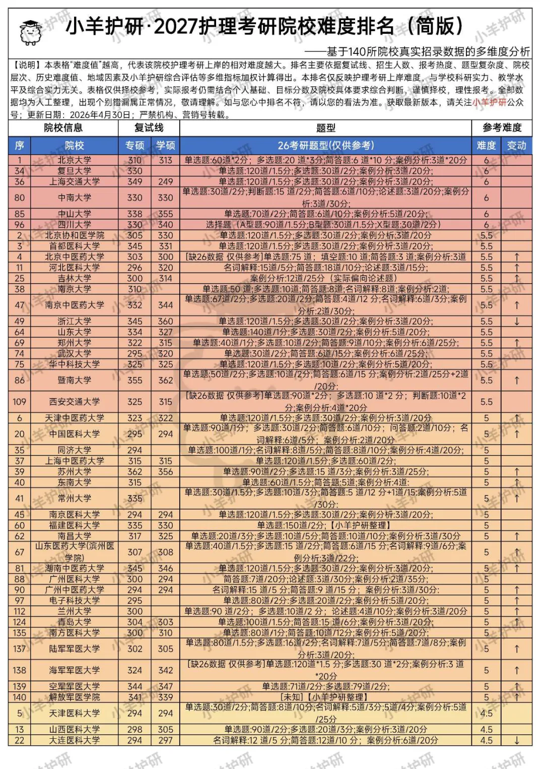 本次《小羊护研2027护理考研院校难度排名》共统计全国140所护理硕士招生院校。
