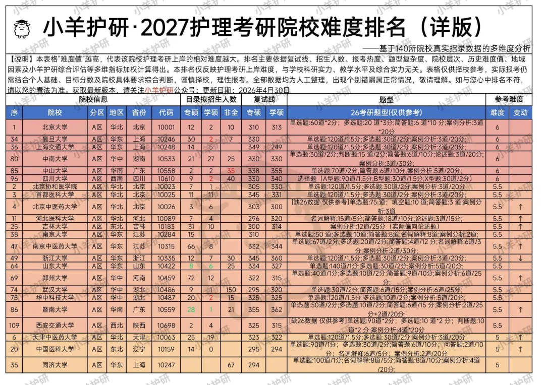 亲爱的护理考研人:《小羊护研2027护理考研院校难度排名》正式发布!