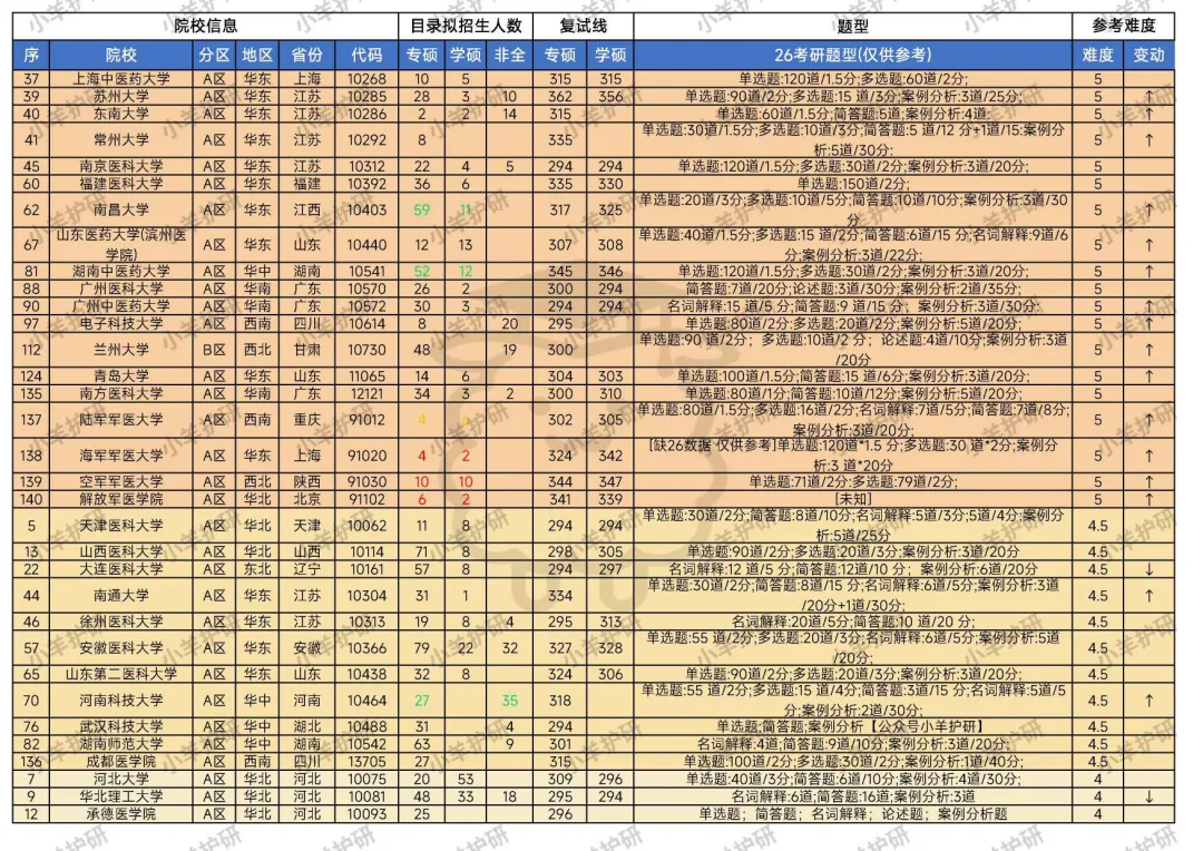 🔹题型复杂度难度系数:分析各院校历年真题,从题型丰富度(选择题、简答题、病例分析题等)、真题难易程度、知识点考察深度三个维度量化,题型越复杂、真题难度越高,系数越高。