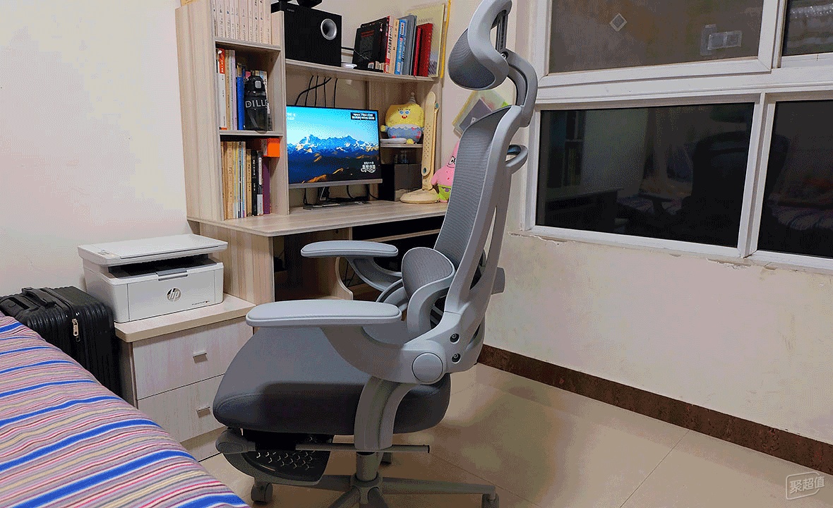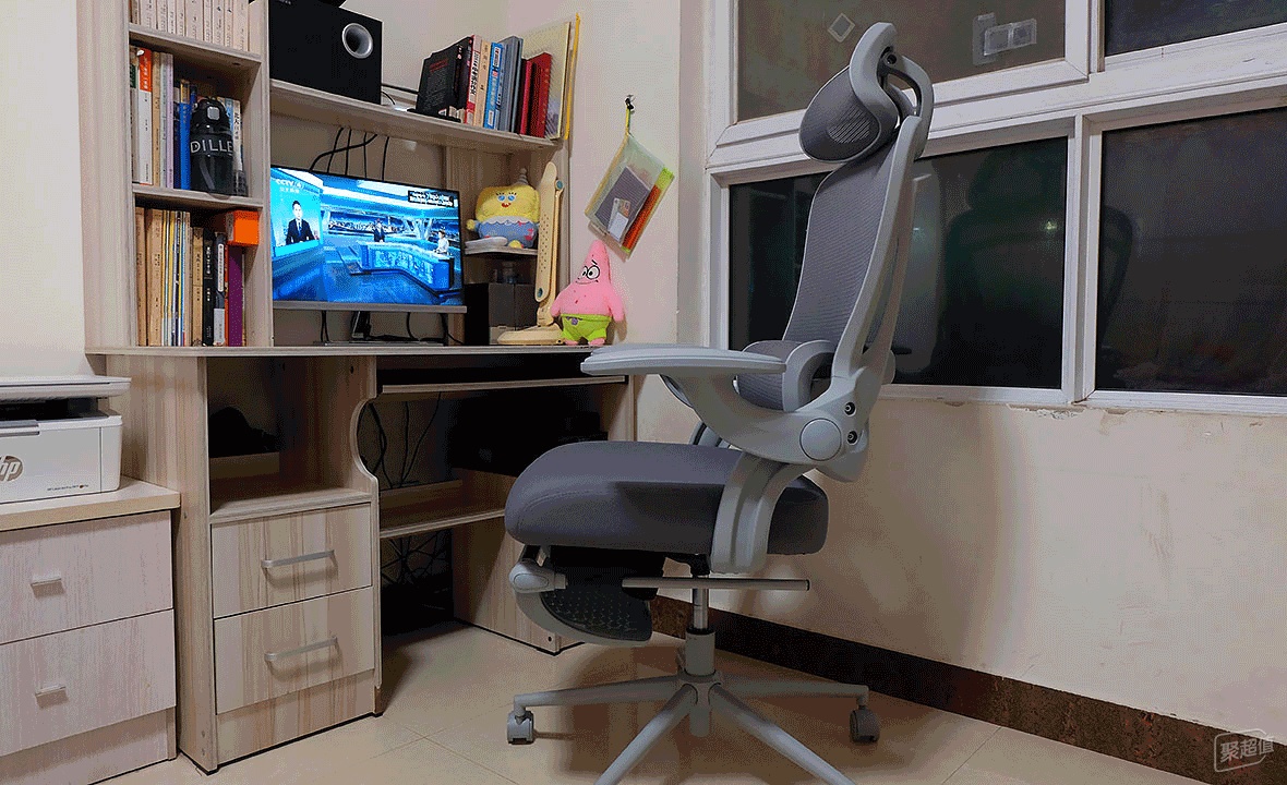 而用了恒林逆袭者工学椅,只要把椅背往后调,直到卡到130°的位置,再伸手从坐垫下方一拉——隐藏式抽拉搁脚“哗啦”一下就可以滑出来,银灰色的工学椅搁脚,刚好能托住整个小腿。