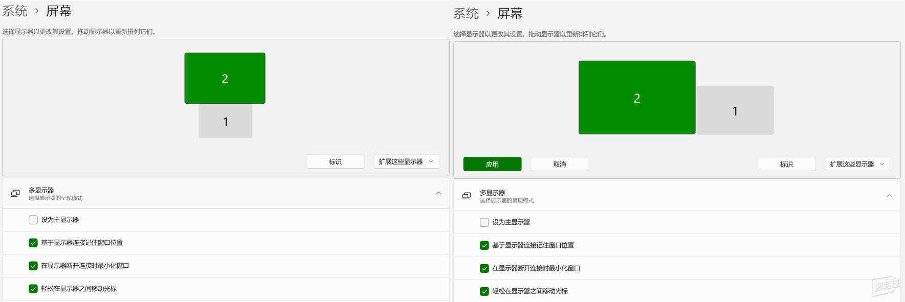 线材连接好后,在设置-系统-屏幕中,开启拓展到屏幕2,然后根据实际物理位置拖拽一下方框2的位置即可。在此页面中还可以设置缩放比例、屏幕方向等。