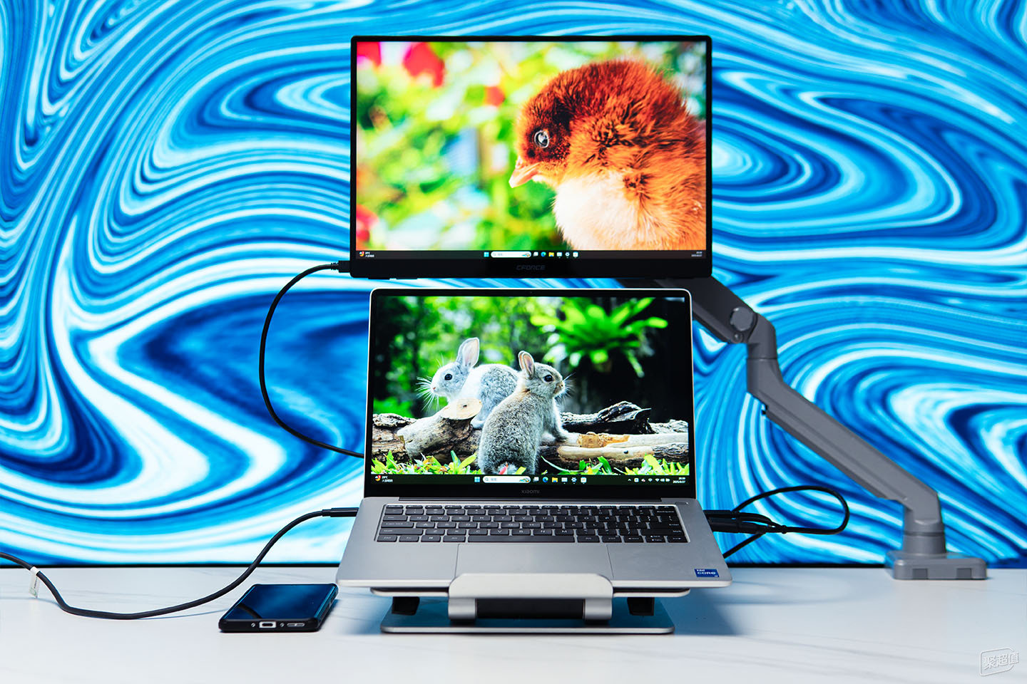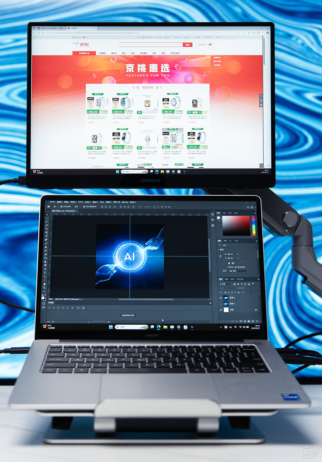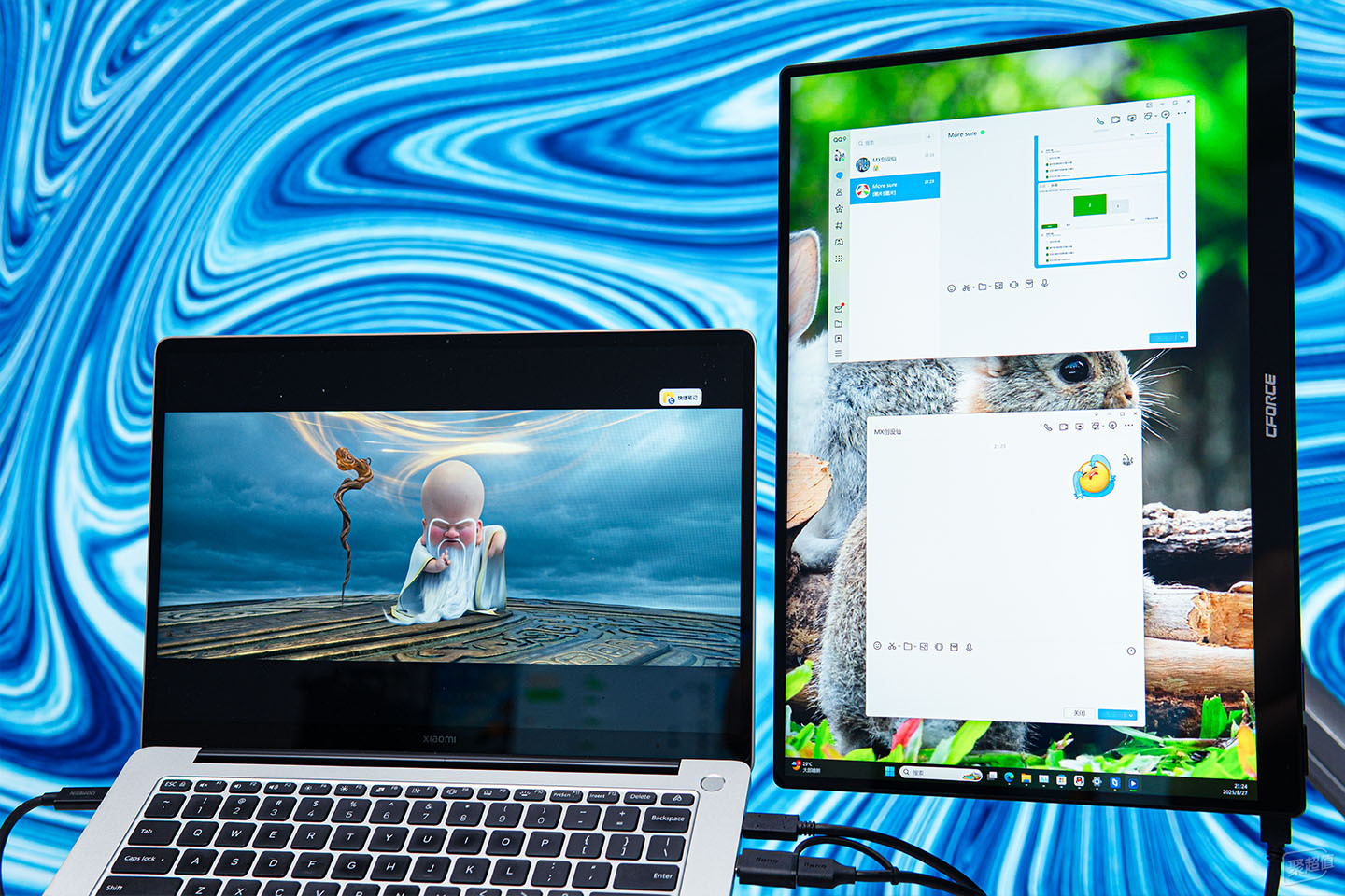 我这台小米笔记本屏幕是14英寸的,平时窗口多开的话,要来回返回桌面,因为屏幕小,分屏模式用的非常少,而连接CFORCE 116Q后,拓展出来的大屏显示要比原来的屏幕还要清晰,我就特别喜欢搞PS时,副屏开着各种网页查资料做参考。