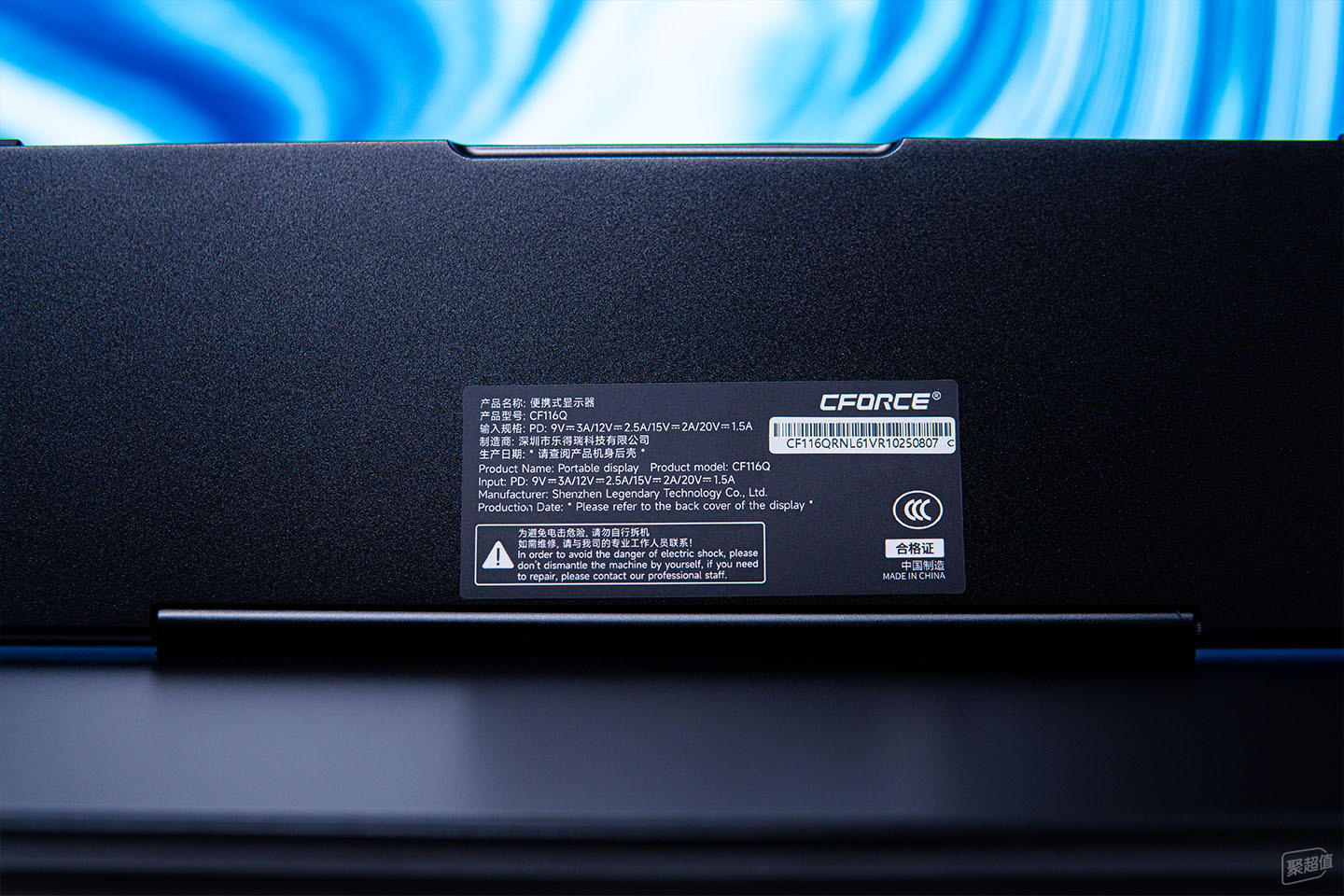 从背部标签可以看到CFORCE 116Q多供电只需要30W,因此和大部分笔记本都可以实现一线连接,如果是外出携带使用,带个充电宝就能给屏幕供电。