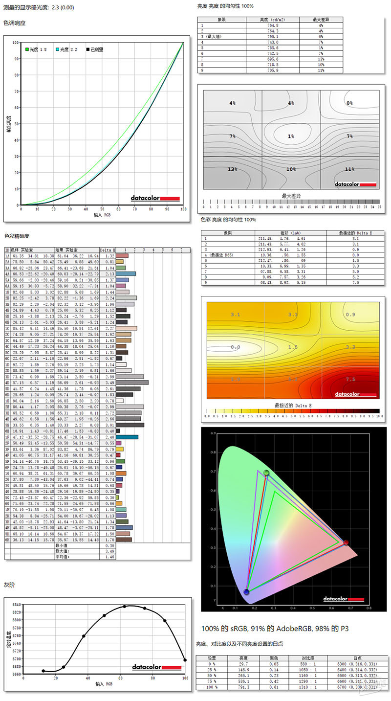 通过红蜘蛛实测手头这台,CFORCE 116Q色域覆盖100%sRGB、91%AdobeRGB、98%P3,光度为2.3,基本贴合标准光度2.2,默认灰阶色温在6660-6840之间,相比标准色温稍微偏冷,SDR亮度下最高可达791nit,对比度可达1310:1,白点色温在6300-6700之间,色彩均一性方面,区域9偏差最大,ΔE为7.5,亮度均一性方面,区域9偏差11%,色彩准确度上,ΔE最大为3.49,平均为1.46,大部分色彩ΔE都小于2,总体来说屏幕素质非常出色。