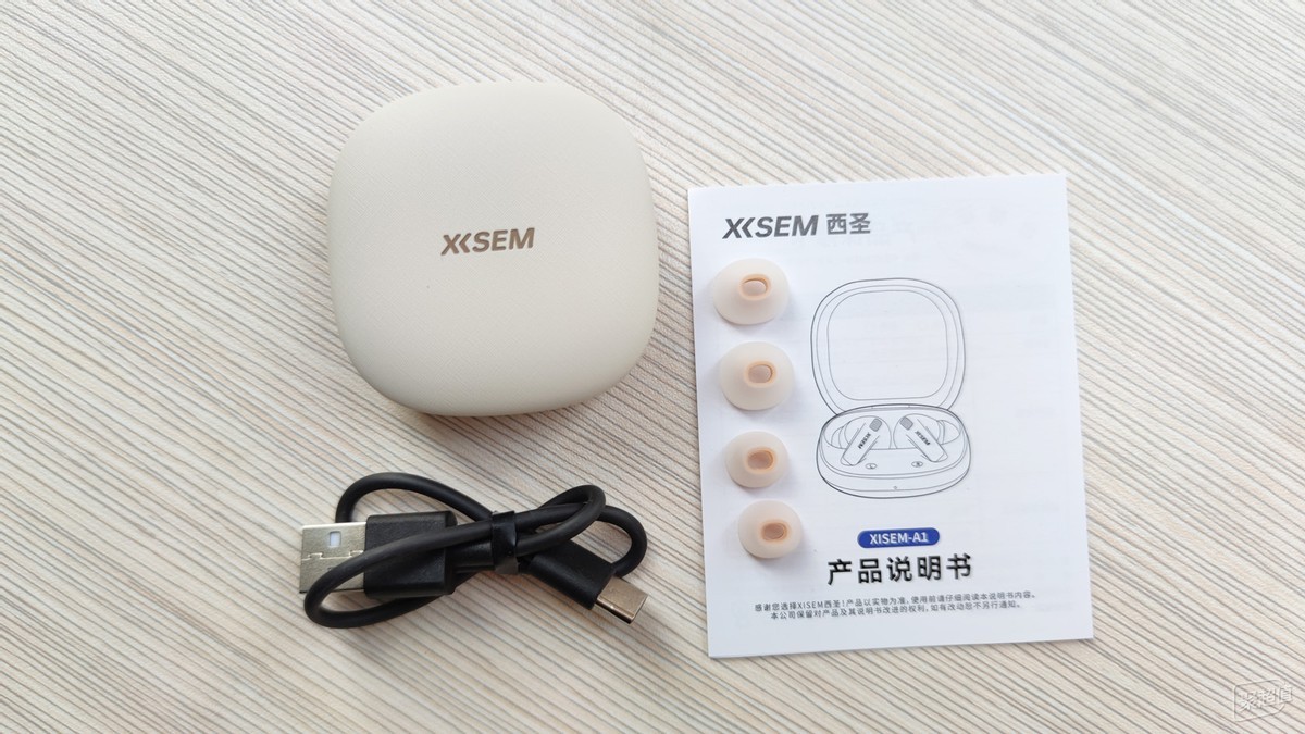 西圣A1耳机还配了三种尺寸的亲肤抗菌柔感耳帽,透明中带着卡其色。