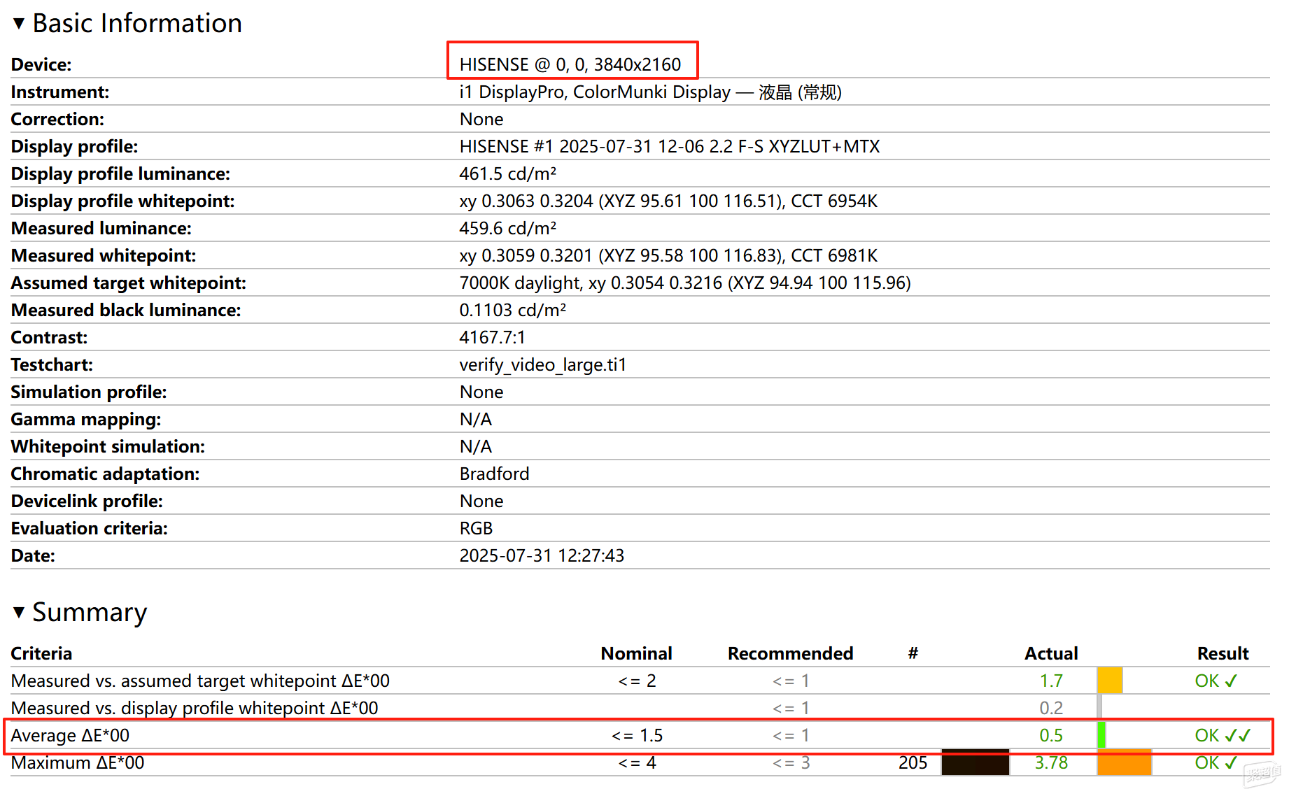 表达颜色准确性的色准方面,官方宣传ΔE≈0.7,使用视频大模型测得色准平均ΔE=0.5,这是个什么水平呢?