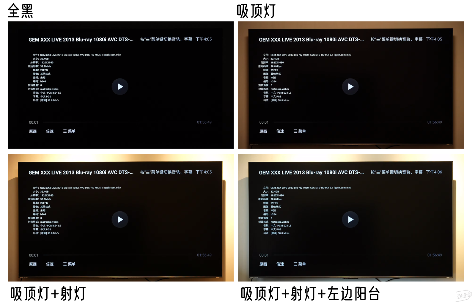 这对我们喜欢晚上看电视、客厅光线明亮的环境非常实用,实际使用很难在沙发位置被反射影响到。上图是观影位置拍下4种光线下的电视,完全看不到屏幕有反射现象。