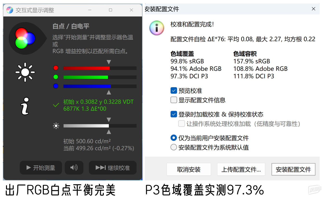 出厂状态RGB白点平衡完美,软件测出全屏亮度500cd/㎡;