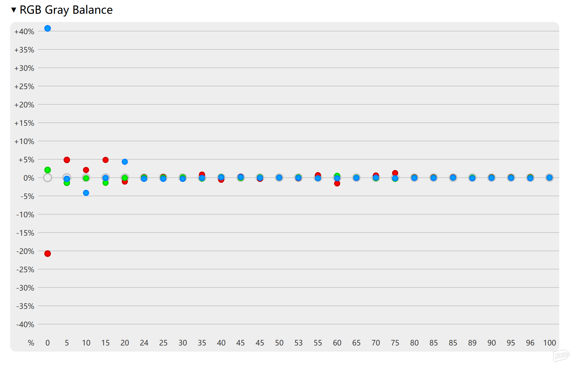 RGB灰平衡方面,亮度只要超过20%,直到100%都是几乎完美的状态。