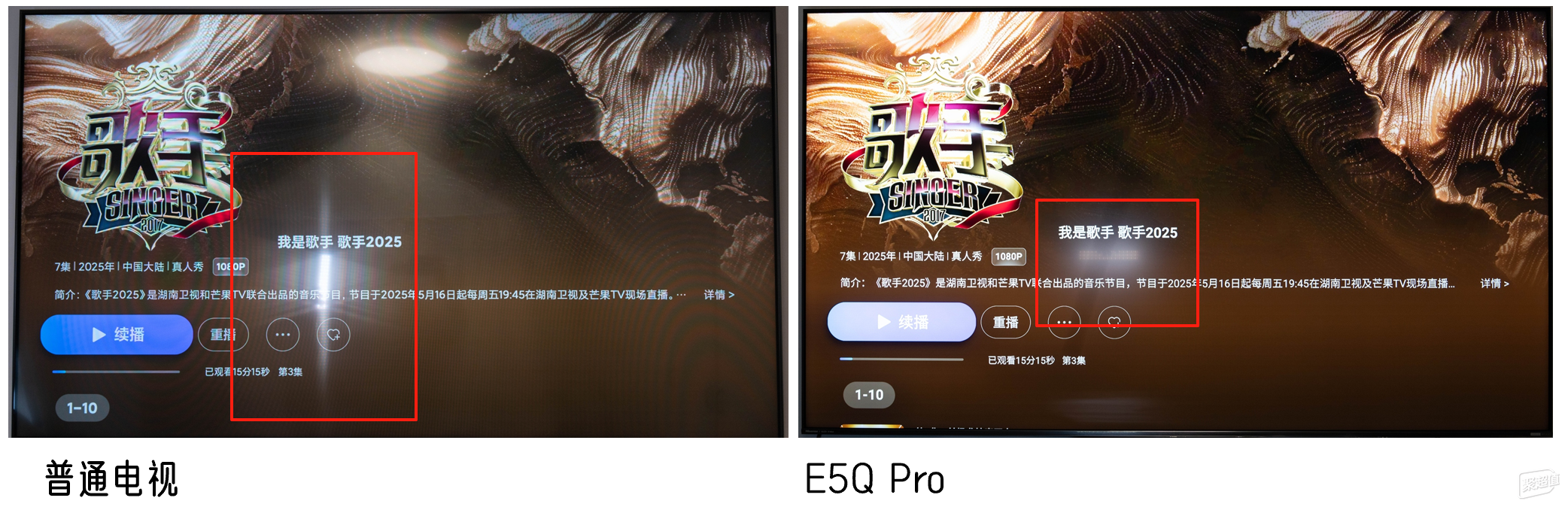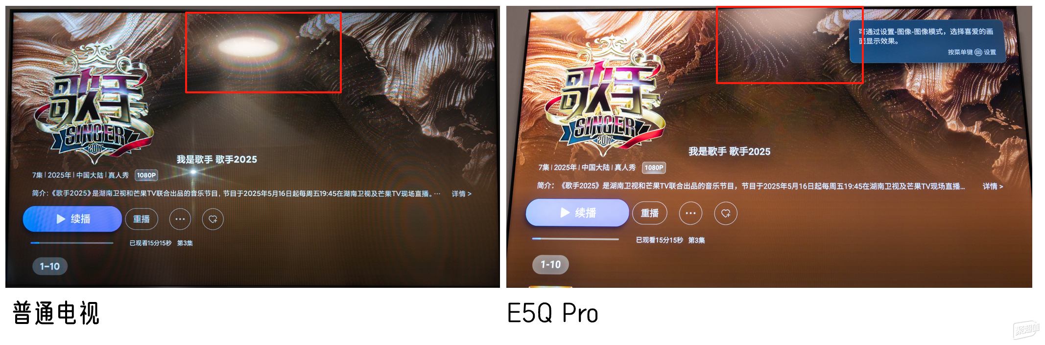 以家里常见的吸顶灯为例,左边的普通电视没有低反膜,对比起来有AGLR低反技术的E5Q Pro效果非常好。